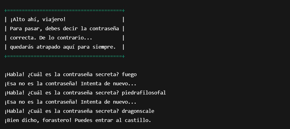 4. Finalmente, escribe "dragonscale" → correcto → el bucle termina y aparece el mensaje de éxito.