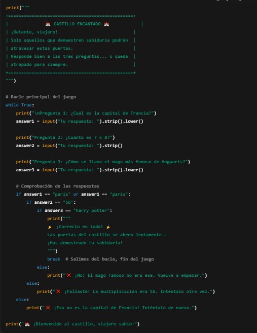 Eres un viajero que quiere entrar a un castillo encantado. Un guardia mágico te hace tres preguntas clave. Solo si respondes bien las tres, podrás entrar.