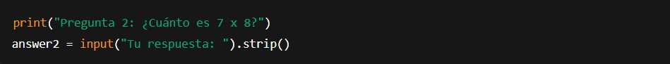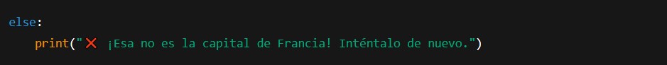 .lower(): convierte la respuesta a minúsculas, para que «París» y «parís» se consideren iguales.