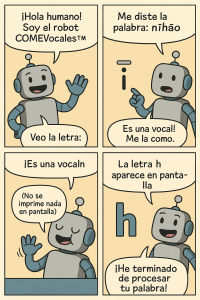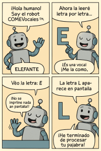 Este robot llamado COMEVocales™ te guía paso a paso y convierte tu palabra en una historia:
