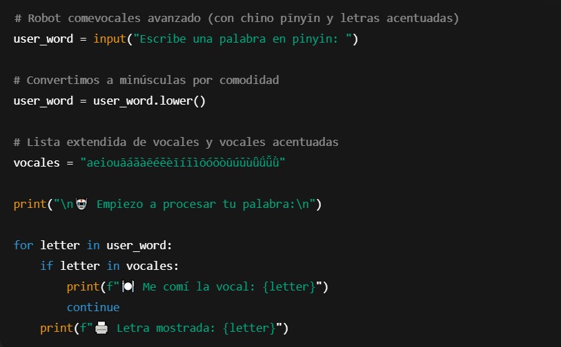 Vamos a adaptar el robot comevocales al idioma chino, usando palabras con pīnyīn (la romanización del chino mandarín). También veremos cómo modificar el programa para que funcione con acentos y caracteres internacionales, como en español, francés o inglés.