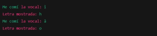 Resultado: solo se imprimen las consonantes h, y si quitamos todas las vocales, la palabra se reduce. También se imprime la n.