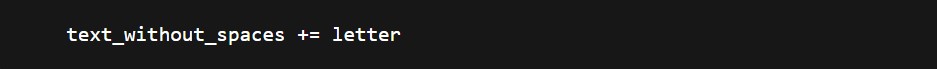 Usamos += para concatenar (añadir) el carácter actual (letter) al final de la cadena text_without_spaces.