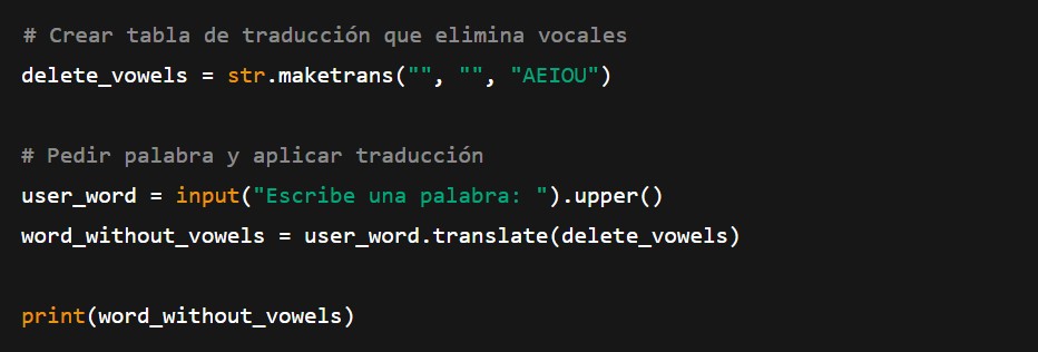 str.maketrans(«», «», «AEIOU») crea una tabla que dice: “para estos caracteres (AEIOU), no pongas nada”.
