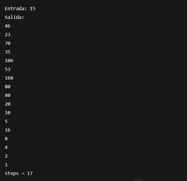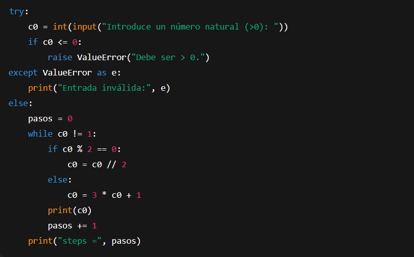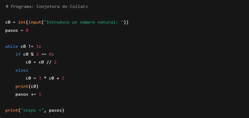 Vamos a implementar este proceso con un bucle while. El programa pedirá un número al usuario, lo procesará según la regla y mostrará todos los pasos hasta llegar a 1, contando además cuántas iteraciones han sido necesarias.