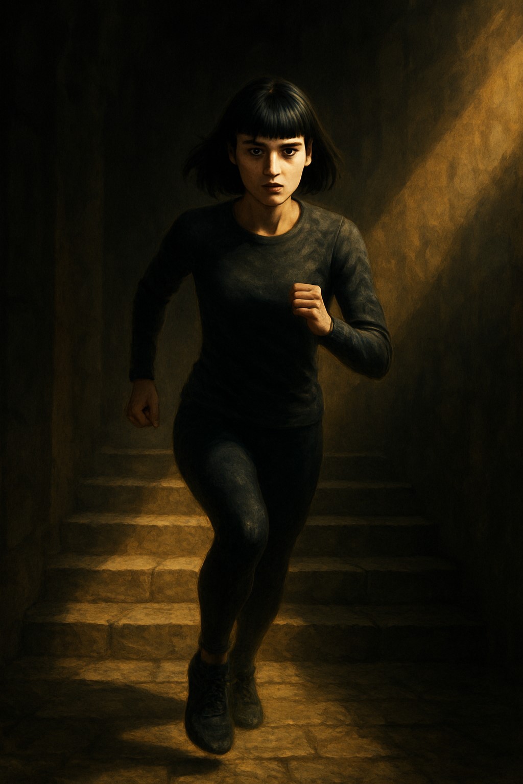 A girl is coming down a flight of stairs. The passage is narrow and twists back on itself, but she takes each step slowly, her boots meeting each tread with a thud, as though every descent is also a claim of identity. The flagstone beneath her is slashed by long strips of light, and the scuffed leather of her boots tells of roads no one else dared to take. Her hand, resting on the latch of the door to the stairs, steadies her—but only for a moment. Where most would hesitate, she advances.