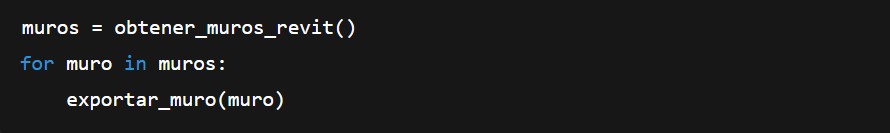 exportar_muro: leer parámetros (tipo, material, dimensiones), convertir geometría a formato abierto, escribir a JSON/IFC/BD, marcar el muro como “procesado”, etc. -