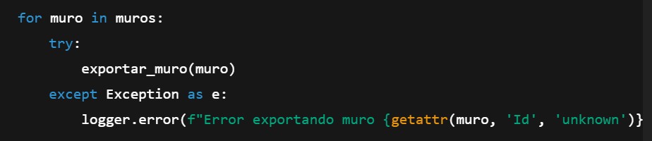 muroscambia durante la iteración (por ejemplo siexportar_muroañade/quita elementos de la misma colección), el comportamiento puede ser inesperado; mejor iterar sobre una copia si vas a mutar la colección:for muro in list(muros):