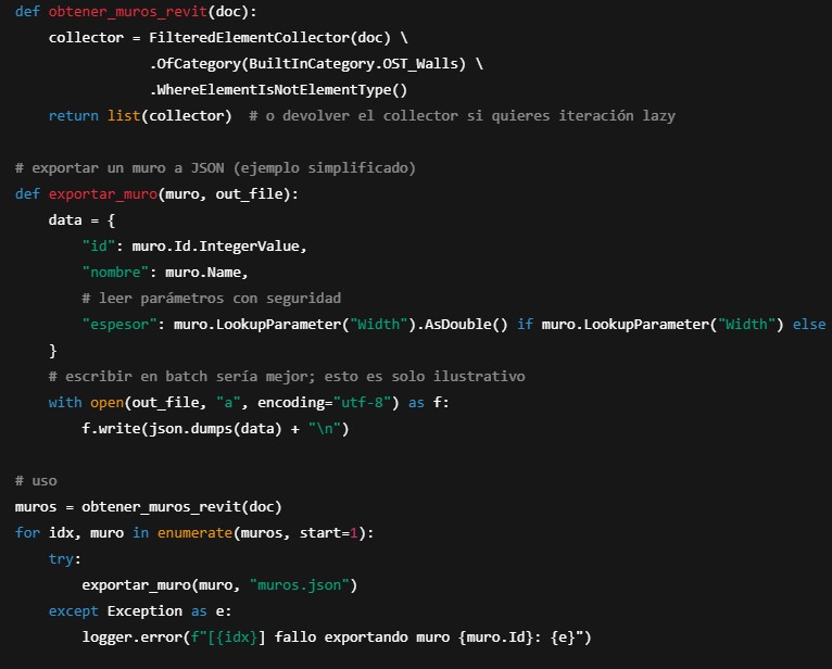 obtener_muros_revit()es la entrada a la tubería de conversión yexportar_muro()es la transformación/salida — igual que los ejemplos simples, pero con reglas, transacciones y restricciones del API de Revit.