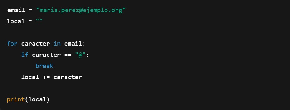 - Por qué usar for + break aquí: el patrón es explícito y útil cuando quieres procesar un flujo de caracteres y detenerte ante un delimitador. Sirve bien en casos donde no quieras o no puedas usar métodos de cadena (por ejemplo, por razones didácticas o por procesamiento especial carácter a carácter).