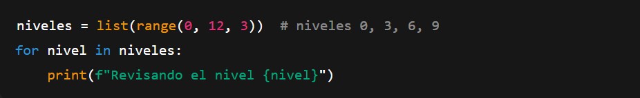 Recomendación: si la secuencia es grande (muchos niveles o muchas iteraciones), itera sobre range(…) directamente en lugar de crear una lista con list(range(…)) para ahorrar memoria: