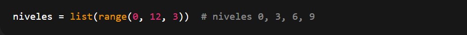 Si no necesitas la lista para otras operaciones, podrías evitar la conversión y escribir directamente for nivel in range(0, 12, 3):, consumiendo menos memoria.