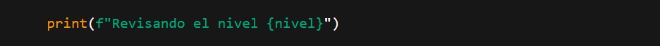 f»Revisando el nivel {nivel}» es una f-string (cadena formateada). Dentro de {} se evalúa la variable nivel y su valor se inserta en la cadena.