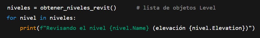 En Revit, un nivel real no es solo un número; suele ser un objeto con propiedades (Name, Elevation, Id). Aquí hemos usado números como ejemplo conceptual (p. ej. identificar niveles 0, 3, 6, 9).