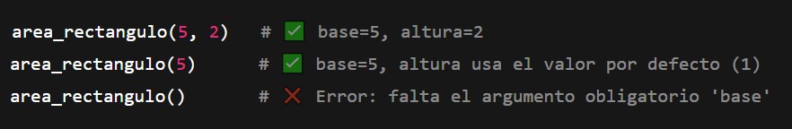 Importante: el valor por defecto (1) se evalúa en el momento de definir la función. Si el valor por defecto fuera un objeto mutable (por ejemplo una lista []), podría compartirse entre llamadas (caveat).