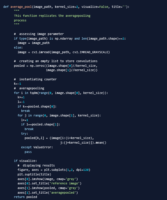 In this section, we will use manually written pooling functions to visualize the pooling process and better understand what actually goes on. Two functions are provided, one for max pooling and the other for average pooling. Using the functions, we will attempt to pool the image.