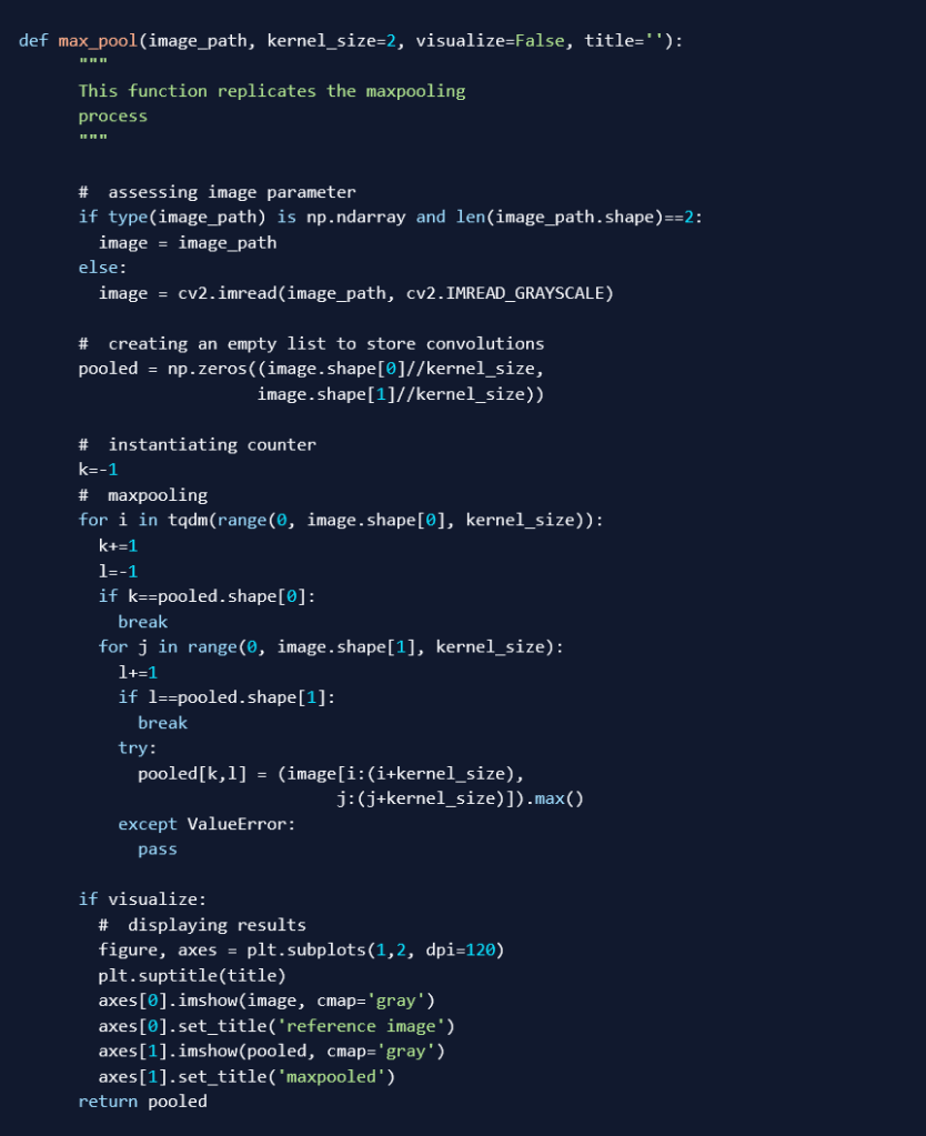 In this section, we will use manually written pooling functions to visualize the pooling process and better understand what actually goes on. Two functions are provided, one for max pooling and the other for average pooling. Using the functions, we will attempt to pool the image.