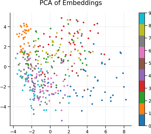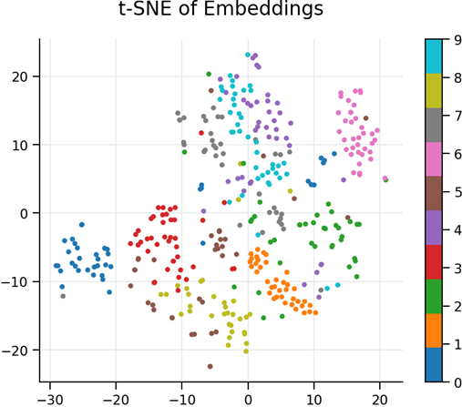 - The spread of points suggests that the embeddings capture rich variability between digit classes.
