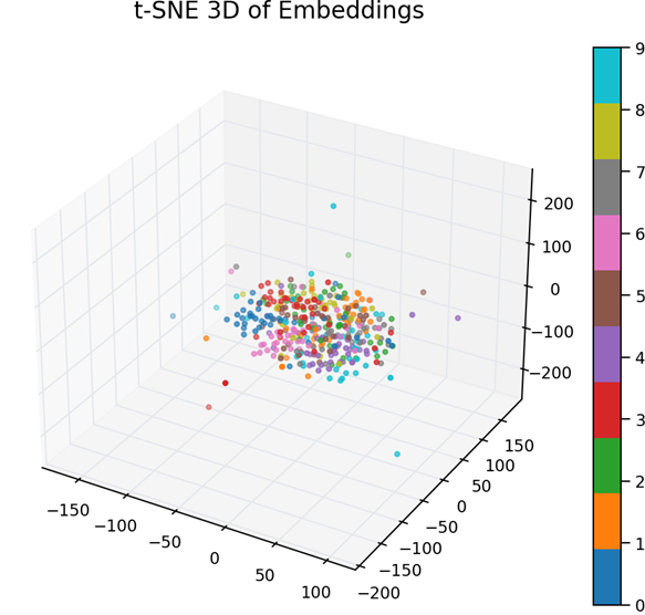 - Cluster boundaries are much sharper than PCA, showing that the embeddings contain strong class separation.