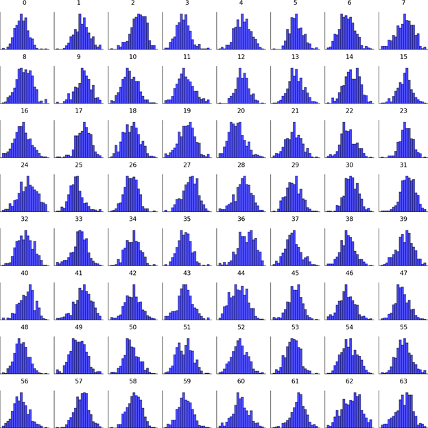 This grid shows a histogram for each of the 64 embedding components: